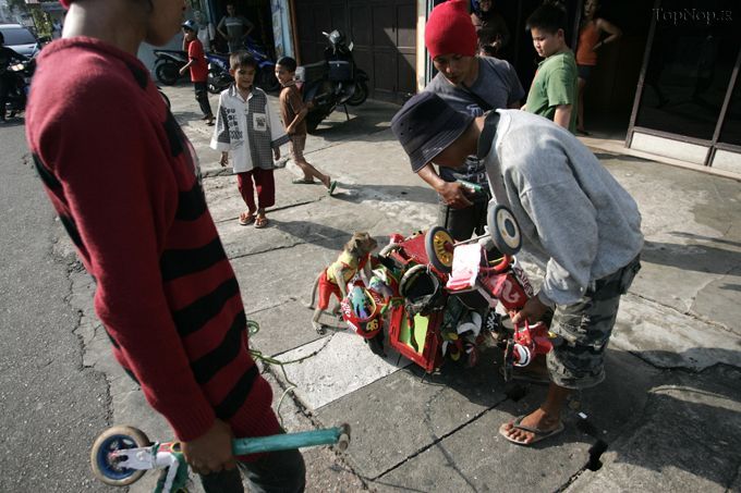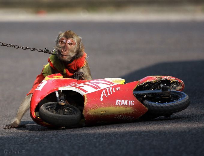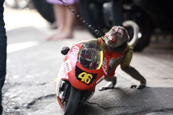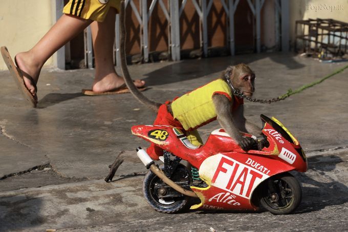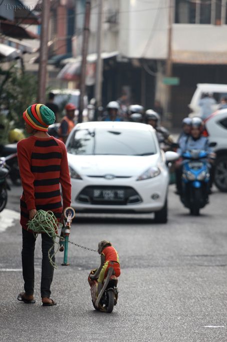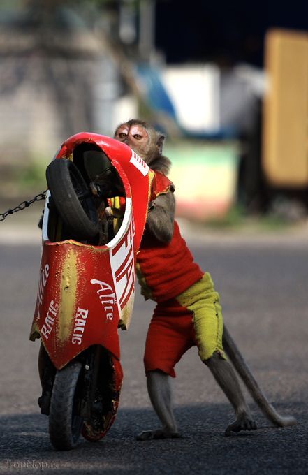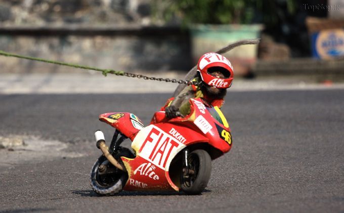 این میمون و صاحبش در اندونزی کارو کاسبی خوبی برای خود به راه انداخته اند ، این میمون با نمایش های دیدنی خود با موتور کوچکش به مدت 10 دقیقه مردم را سرگرم میکند و سپس خودش اقدام به جمع آوری پول تماشاگران میکند.