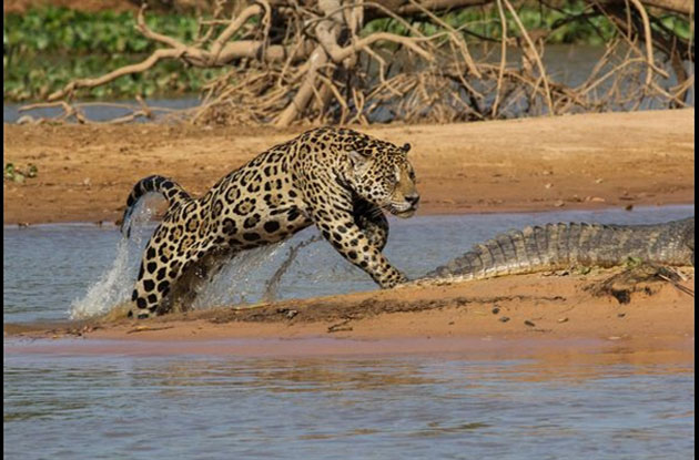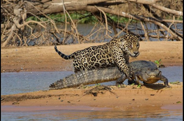 حمله یک پلنگ خالدار آمریکایی به تمساح در رودخانه " ترس ایرمائوس" برزیل