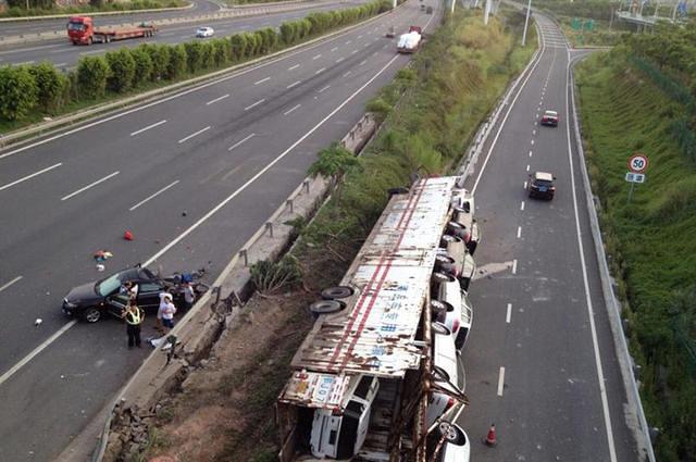 در شرق چین در شهر ژجیانگ یک کامیون باری حمل خودرو با یک دستگاه سواری برخورد کرده که این مسئله باعث واژگون شدن کامیون می‌شود.